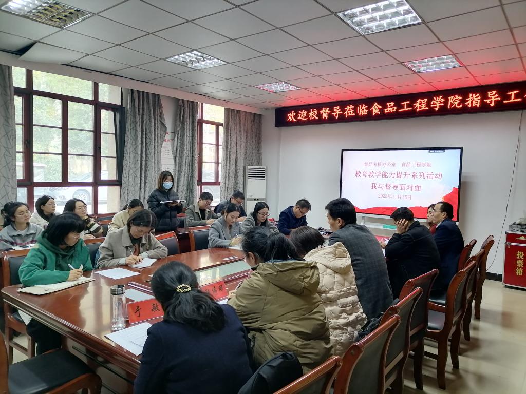 为提高青年教师教学能力,提升我校教学质量,加强教风、学风建设,增强全体师生的质量意识,促进学校育人工作高质量发展。1115日,督导考核办公室在食品工程学院会议室东办公楼104举行了以以学生为中心,增强质量意识--我与校督导面对面为主题的教育教学能力提升活动。食品工程学院党政领导、督导考核办公室工作人员、校督导代表和食品工程学院教师参加了活动。会议由食品工程学院党委副书记王广良主持。
