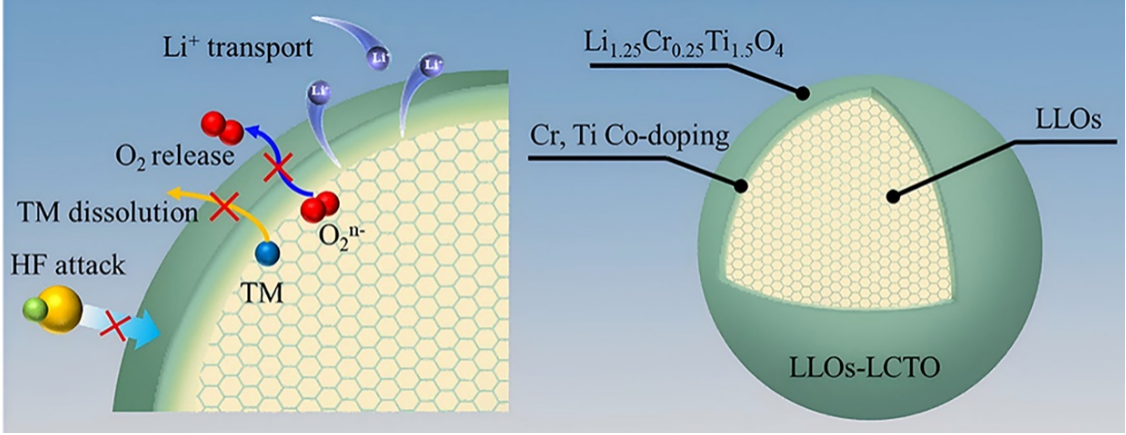 在这项研究中,我们首次提出了一种离子导体材料Li1.25Cr0.25Ti1.5O4(LCTO),用于构筑富锂层状氧化物(LLOs)的保护层。在LLOs表面LCTO包覆层以及Cr3+和Ti4+表面共掺杂层的协同作用下,有效抑制材料内部应变积累、氧释放和界面副反应,从而显著提高循环稳定性、倍率性能和电压保持率。同时,该项工作在实验室已实现公斤级生产。团队成员王二锐博士为论文第一作者,团队成员唐婧教授和北京工业大学张旭教授,尉海军教授为共同通讯作者。研究得到了国家自然科学基金、安徽省教育厅重点研究项目及安徽省高峰培育学科等项目资助。(特约通讯员:路润麟 审核:张炎 黄树桥)