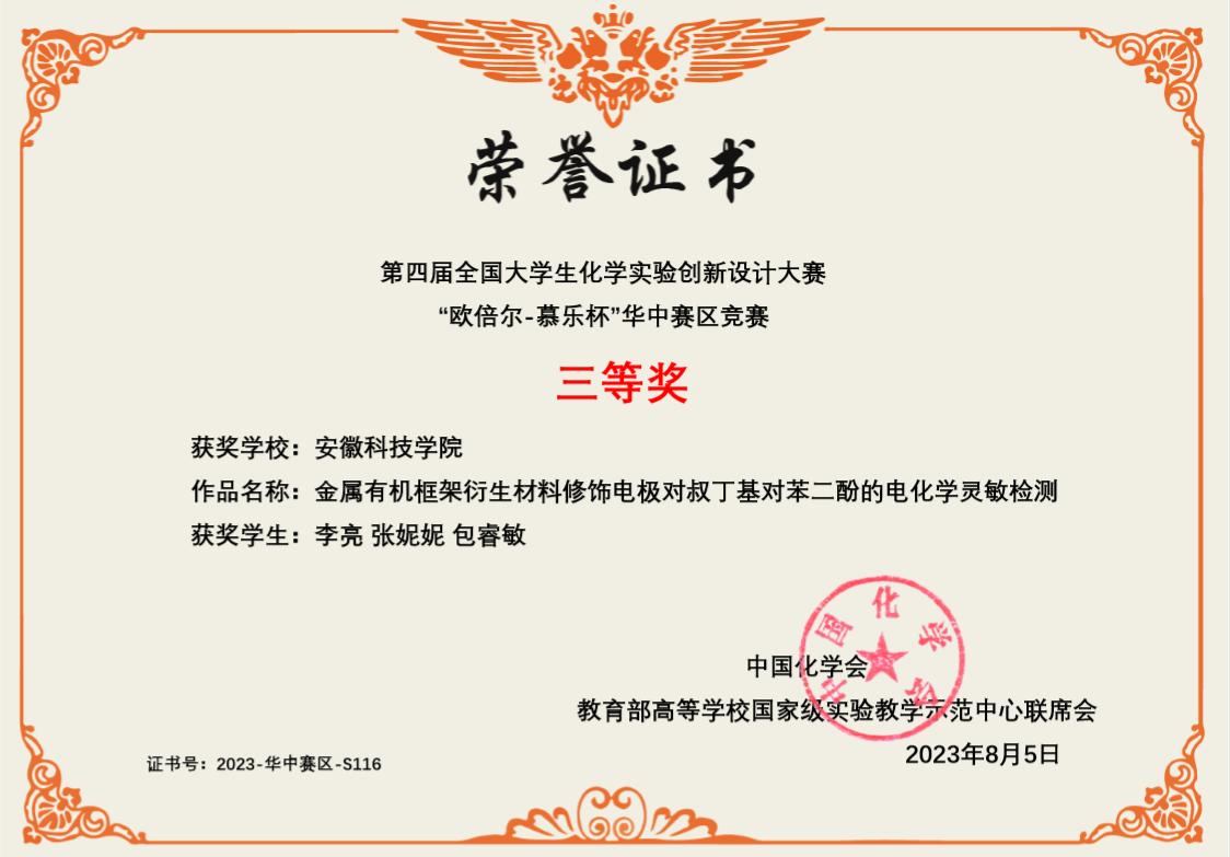 我校化学与材料工程学院学子李亮、张妮妮、包睿敏在郑胜彪、胡瑞章老师指导下,在实践课程改革和创新实验设计的基础上组建了新创实验代表队,参加华中赛区比赛。经过专家评审,我校新创实验代表队的作品“金属有机框架衍生材料修饰电极对叔丁基对苯二酚的电化学灵敏检测”获得三等奖。