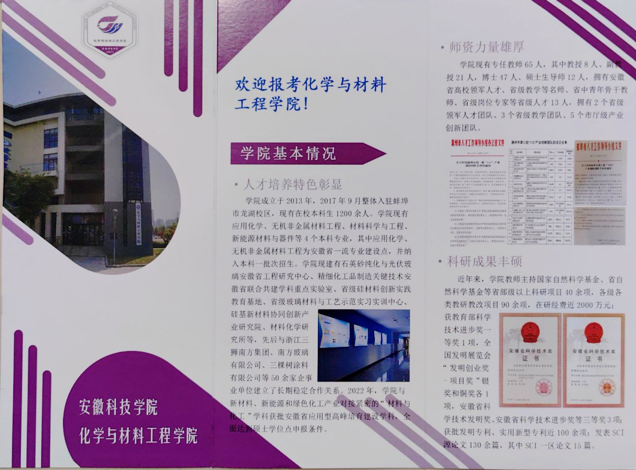 为积极应对新旧高考志愿填报模式转变可能带来的生源质量变化挑战,化学与材料工程学院在高质量完成学校下达的招生宣传任务基础上,学院还制作了“欢迎报考乐玩在线化学与材料工程学院”H5易企秀,组织师生利用微信群、QQ群宣传;学院印制了“欢迎报考化学与材料工程学院”纸质宣传册子,随同学校的宣传材料一并发放,主动向有化学及材料类报考意愿的考生及家长介绍学院,吸引考生关注学院。