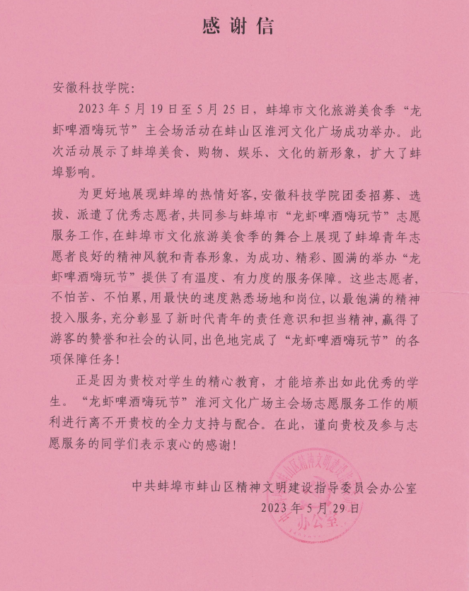 感谢信提到,乐玩在线团委招募、选拔、派遣了优秀志愿者,共同参与蚌埠市“龙虾啤酒嗨玩节”志愿服务工作,在蚌埠市文化旅游美食季的舞合上展现了蚌埠青年志愿者良好的精神风貌和青春形象,为成功、精彩、圆满的举办“龙虾啤酒嗨玩节”提供了有温度、有力度的服务保障。志愿者们不怕苦、不怕累,用最快的速度熟悉场地和岗位,以最饱满的精神投入服务,充分彰显了新时代青年的责任意识和担当精神,赢得了游客的赞誉和社会的认同,出色地完成了“龙虾啤酒嗨玩节”的各项保障任务!正是因为贵校对学生的精心教育,才能培养出如此优秀的学生。“龙虾啤酒嗨玩节”淮河文化广场主会场志愿服务工作的顺利进行离不开贵校的全力支持与配合。在此,谨向贵校及参与志愿服务的同学们表示衷心的感谢。