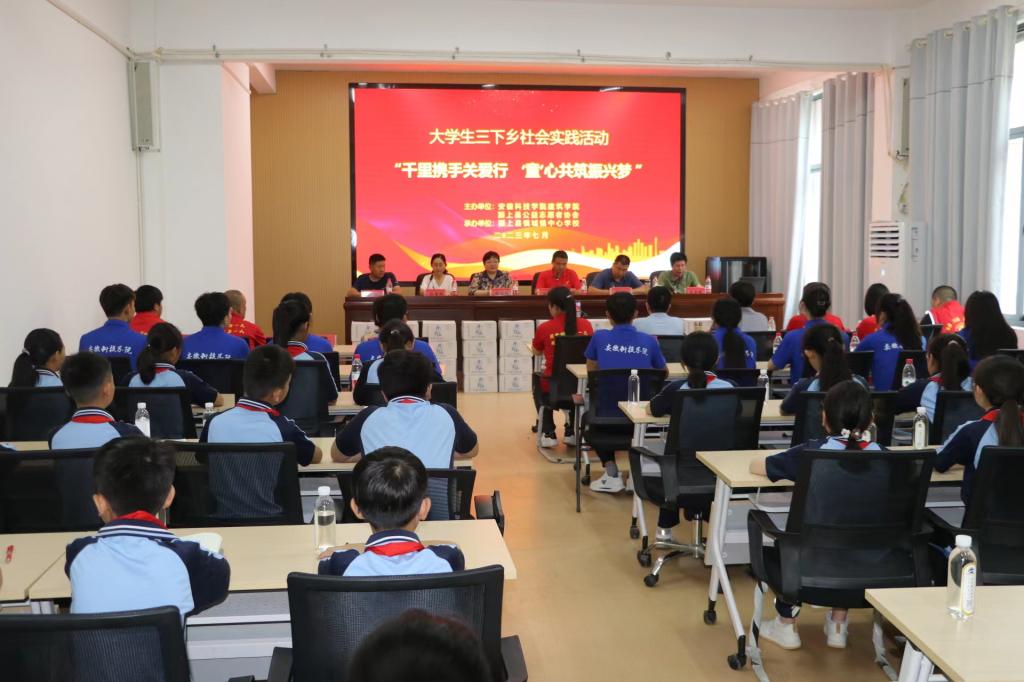 为深入学习贯彻习近平新时代中国特色社会主义思想,强化在实践中受教育、长才干、做贡献,7月15日上午,由乐玩在线建筑学院和颍上县公益志愿者协会主办,颍上县慎城镇中心学校承办的“千里携手关爱行,‘童’心共筑振兴梦”暑期社会实践启动仪式如期举行。建筑学院党委副书记谢宜勤、团委书记沈德艳、团委副书记武辉一行三人前往参加。启动仪式由颍上县公益志愿者协会会长、“中国好人”获得者汤锋主持。