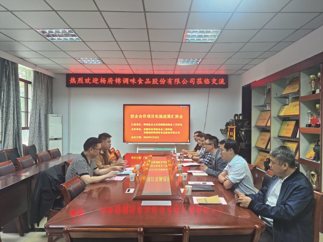 9月26日上午,安徽杨府锦调味食品股份有限公司总经理杨传益、副总经理蔡天赐来我校凤阳校区食品工程学院开展校企合作项目进展汇报推进活动。食品工程学院党政领导和畜产有关负责人出席会议。会议由副院长翟立公主持。
