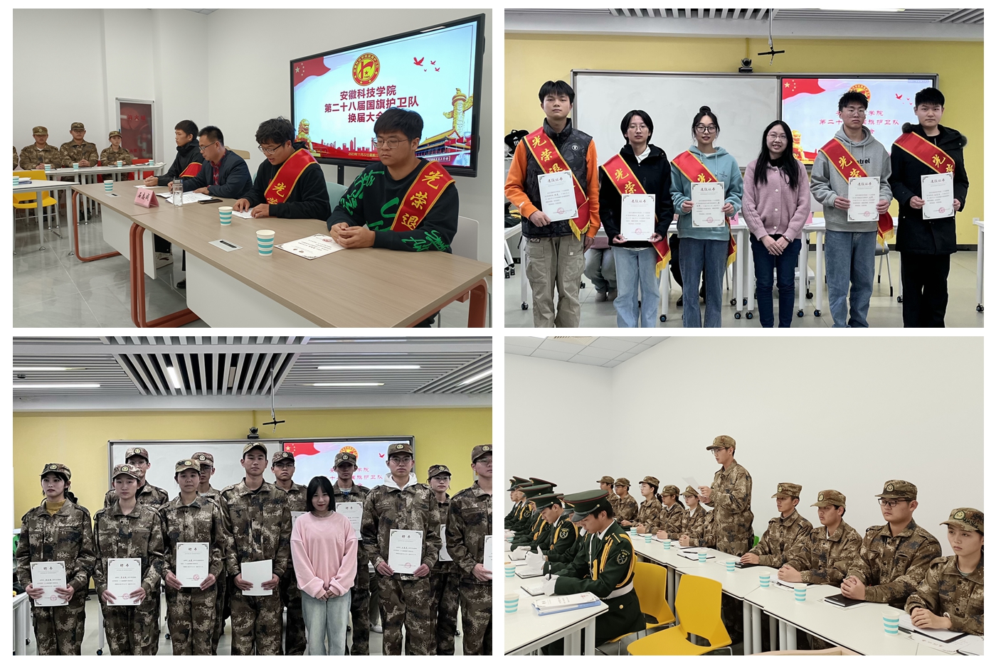 11月22日,我校国旗护卫队分别在龙湖校区学生一站式服务社区二楼会议厅和凤阳校区求知楼307智慧教室举行换届大会。党委学工部副部长、学生处副处长陈君君出席并指导,学生处相关教师受邀参加,校国旗护卫队第28届全体成员和第27届退役队员近百名同学参加换届大会。换届大会由党委学工部秘书、校国旗护卫队指导老师石志成主持。