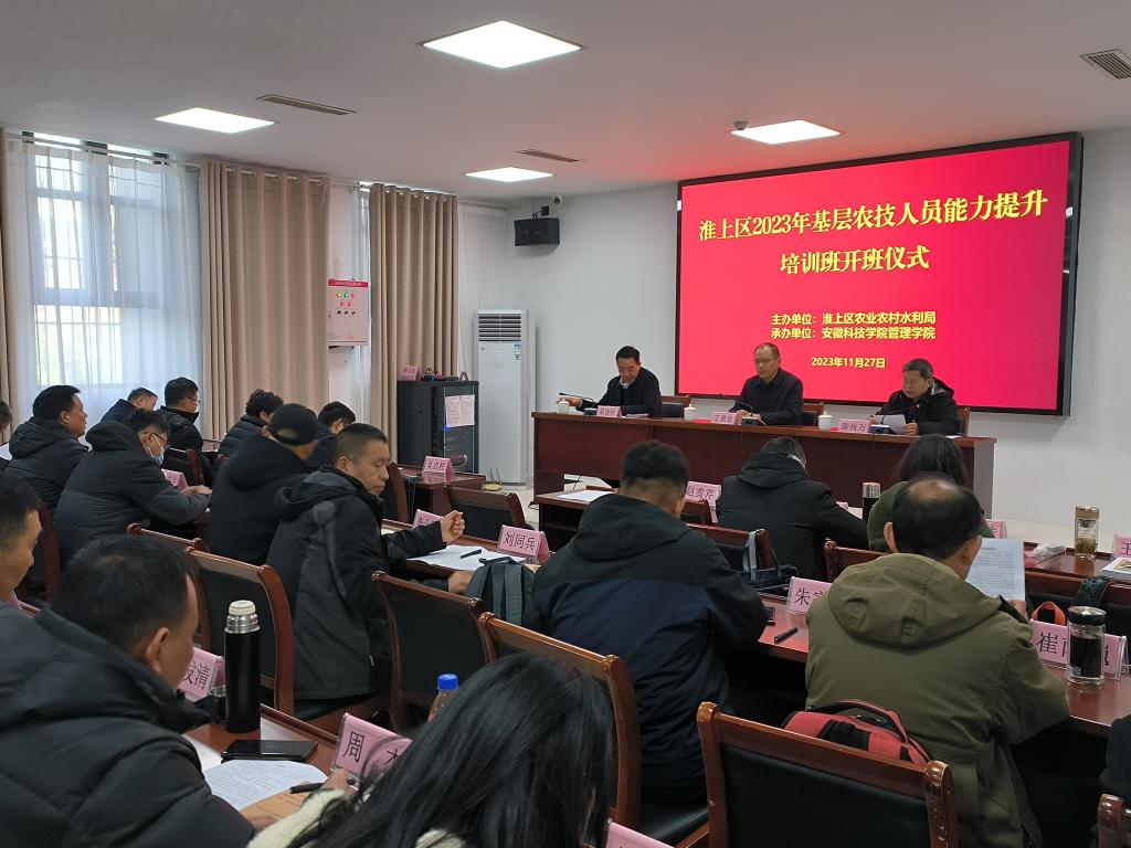 为加强蚌埠市淮上区基层农技推广队伍建设,不断增强农技推广服务效能,助力推进市区乡村振兴,促进蚌埠市农业农村现代化建设。11月27日上午,由蚌埠市淮上区农业农村水利局主办、乐玩在线管理学院承办的“淮上区2023年基层农技人员能力提升培训班”在安徽小岗干部学院举行。蚌埠市淮上区农业综合服务站站长吴言柱、管理学院党委书记丁景良、管理学院院长陈传万出席开班仪式,开班仪式由丁景良主持。