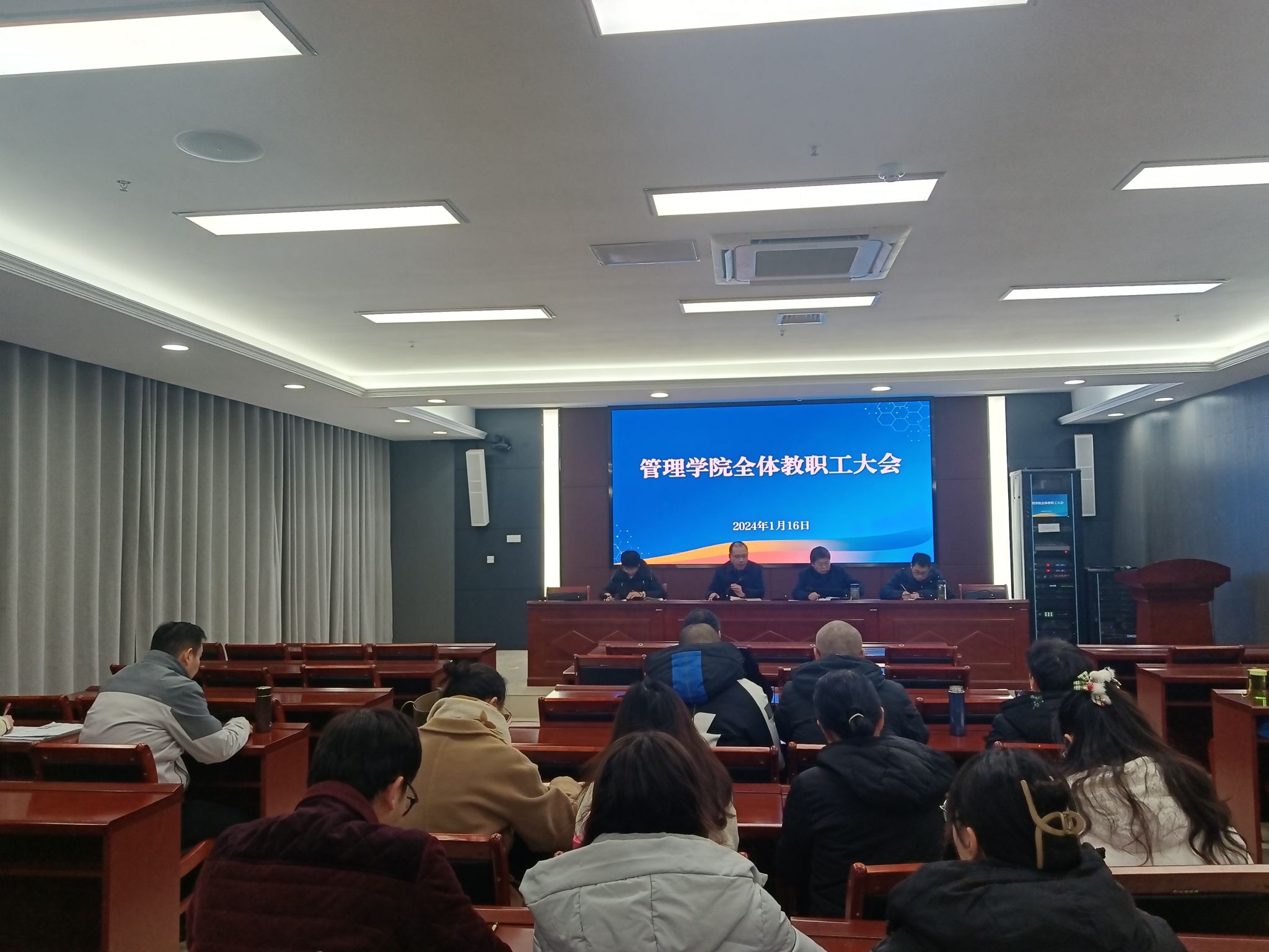 1月16日下午,管理学院在龙湖校区西辅楼111会议室召开期末全体教职工大会,学院党政领导出席会议。会议由学院党委书记丁景良主持。
