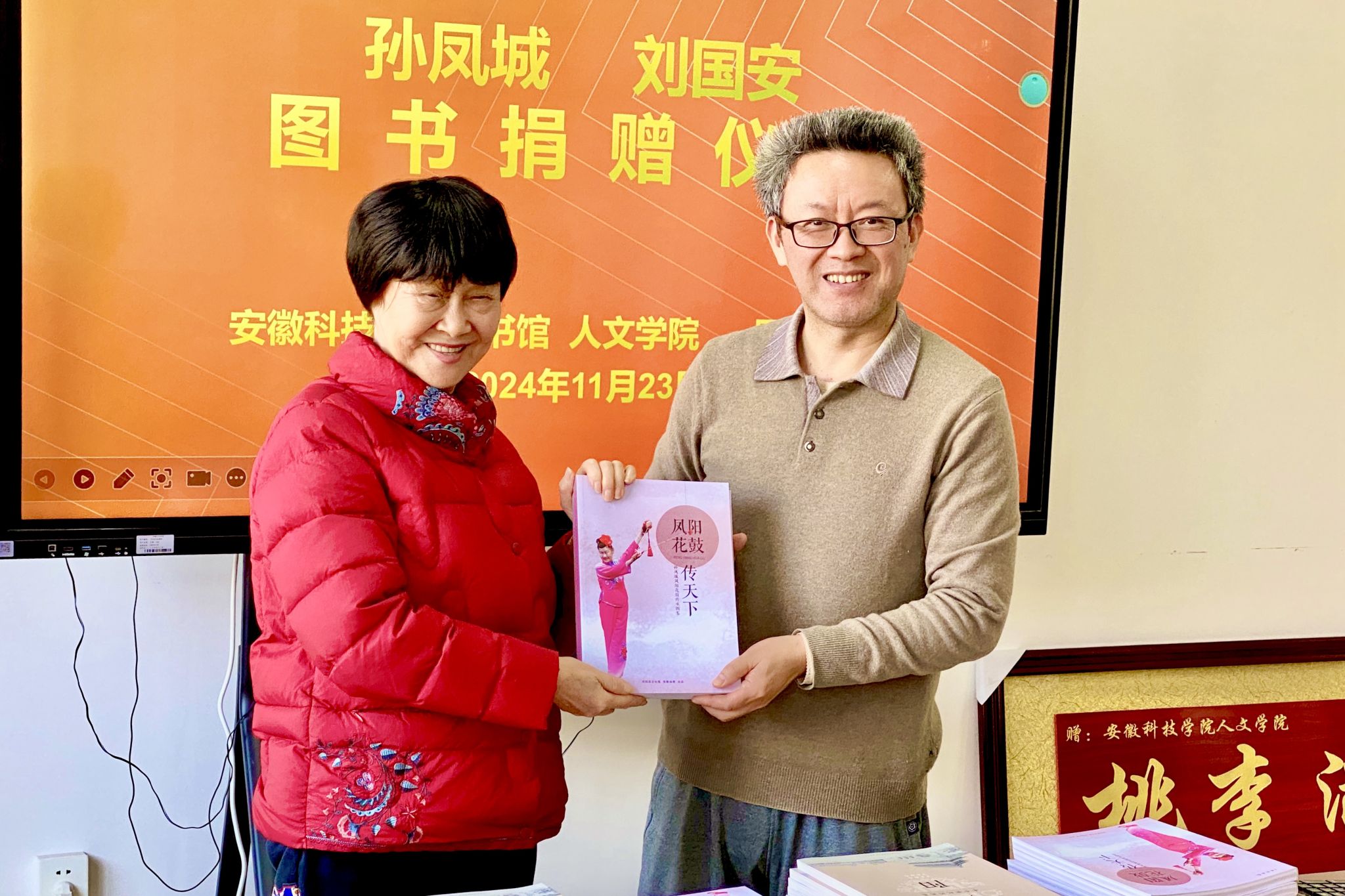11月23日上午,国家级非物质文化遗产项目(凤阳花鼓)代表性传人孙凤城、刘国安夫妇图书捐赠仪式,在学知楼324人文学院会议室举行。乐玩在线客座教授——国家级非物质文化遗产项目(凤阳花鼓)代表性传承人孙凤城和凤阳电视台原副台长、安徽电视台特约记者、中国摄影家协会安徽分会会员刘国安,凤阳县文联主席陈友田,凤阳县教体局原副局长、凤阳年鉴主编张建人;人文学院院长、明文化研究会会长李晓东,图书馆馆长汪徐春、副馆长王玉林,人文学院中文系副主任、明文化研究会秘书长周广超参加相关活动。捐赠仪式由人文学院正处级组织员张严政主持。