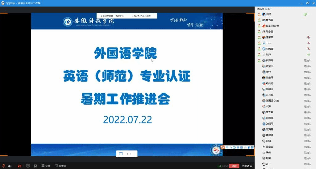 为推进英语(师范)专业认证工作,7月22日上午,外国语学院通过QQ群召开了暑期第二次组长推进会。学院党政领导及专业认证小组组长参会,会议由外国语学院院长刘萍主持。