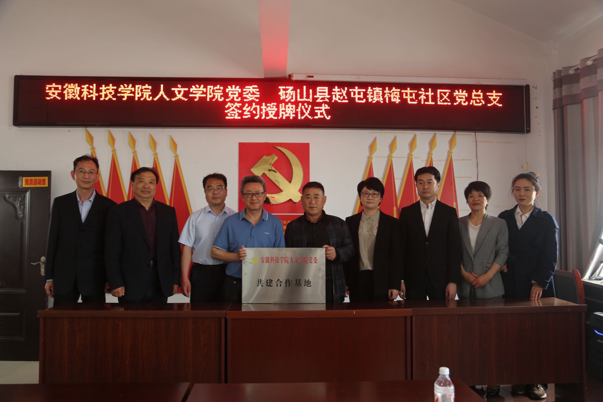 4月11日,人文学院党委与砀山县赵屯镇梅屯社区党总支举行共建合作签约授牌仪式。人文学院党委副书记、院长李晓东,正处级组织员张严政,中文系主任苏兆龙,团委副书记焦雪松,法学系教师范一博,宿州市委网信办主任、市委宣传部副部长梁静,国家税务总局宿州市和砀山县税务局、砀山县委宣传部相关领导,赵屯镇和梅屯社区党政主要负责同志,以及梅屯社区驻村工作队负责同志出席活动。签约授牌仪式由赵屯镇党委书记陈红梅主持。