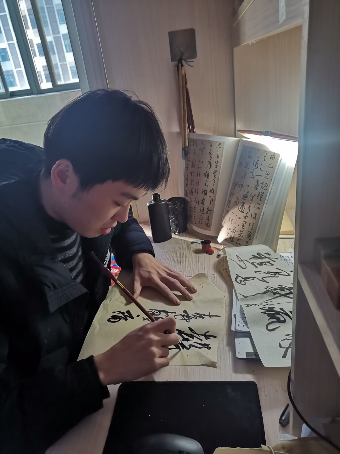 陶乐乐对学习充满热情,善于钻研,乐于将所学的知识融汇贯通并总结出一套自己的学习体系来丰富自己的学识境界。他具有丰富的想象力和创造力,在团队设计专利“数字化供水业务服务平台”的过程中,他提出了用“高斯曲线模型”和“数学方位视角”来解决其中一项有关客户体验感提升方法的问题。他曾以个人名义参加了“第二届安徽省大学生品牌创意设计大赛”A类赛事,并取得了省一等奖。他还十分痴迷于书法艺术,尤爱晋唐时期的潇洒书风。在任职“乐玩在线书美协会副会长”期间,他举办了书法知识竞赛、书法创作分享大会、书法艺术展等多项活动,除此之外,他还计划申请加入中国书法协会。