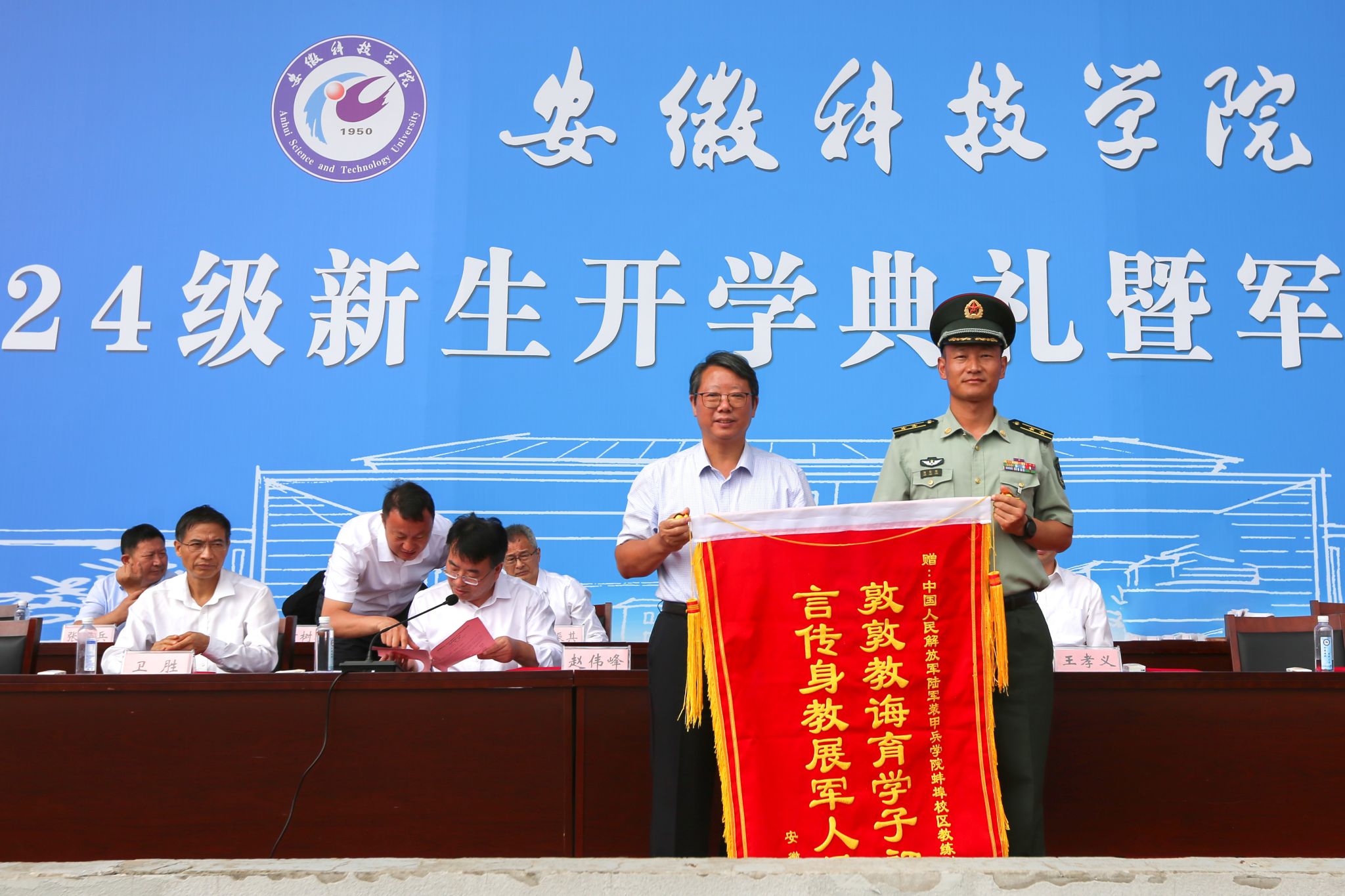 典礼上,李升和代表学校向陆军装甲兵学院蚌埠校区代表杨陈陈赠送锦旗。