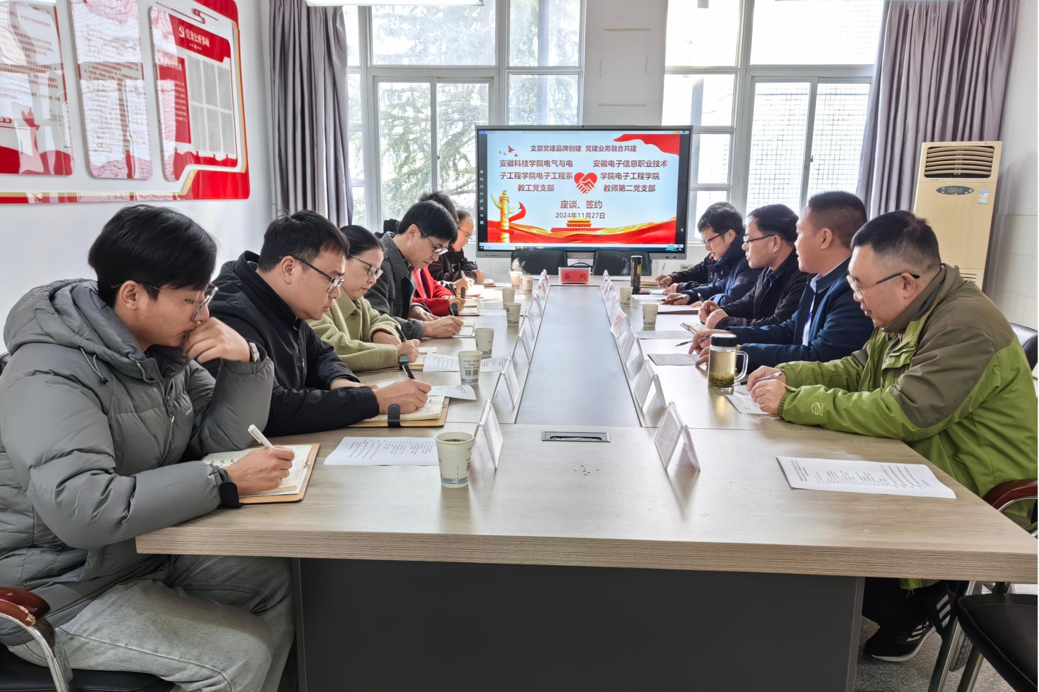 为拓宽高校基层党组织党建工作渠道,构建高校资源共享、相互促进、优势互补、共同提高的党建工作格局,2024年11月27日下午,乐玩在线电气与电子工程学院副院长樊晓宇及电子工程系教工党支部6名党员教师赴安徽电子信息职业技术学院与电子工程学院教师第二党支部开展结对共建主题党日活动。安徽电子信息职业技术学院电子工程学院院长方庆山参加了结对共建签约仪式。