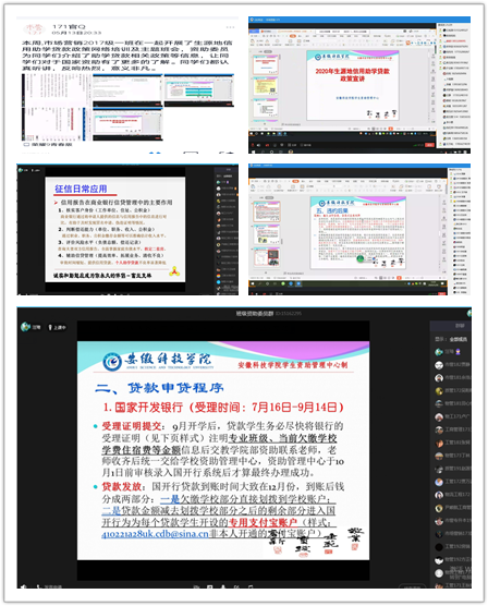 学院资助工作联系人汪琦及各班级资助委员于近日陆续召开了学院、班级层面的助学贷款政策网络培训会。他们通过PPT分别就助学贷款的性质,在校生助学贷款的申请、办理程序及当中的注意事项向同学们做了详细的介绍。并且,还就毕业生助学贷款毕业确认、还款办理、特殊情况处理、支付宝账户使用指南等方面进行了细致的讲解和说明,让同学们进一步意识到自己在毕业后还需要承担的责任和义务,提醒贷款学生务必要按照还款计划及时还清贷款。此外,还通过开展征信知识讲座《征信就在我们身边——个人征信知识简析》对同学们进行资助诚信教育,增强大家的诚信意识,强化资助育人效果。