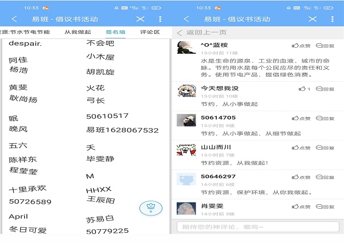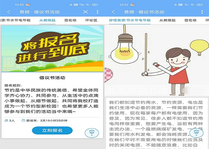 此次活动紧扣厉行节约、反对浪费主题,通过易班线上轻应用搭建,分四个部分向全院学生发起节水节能倡议。第一部分为“珍惜资源:节水节电节能”,讲述“节能减耗”的重要性和必要性;第二部分为“从我做起”,介绍此次倡议书活动的活动规则;第三部分为“签名墙”,以自愿为前提,动员大家在签名墙上签上自己的名字;第四部分为“评论区”,鼓励广大学生在评论区畅所欲言,交流讨论此次活动的心得体会与收获。