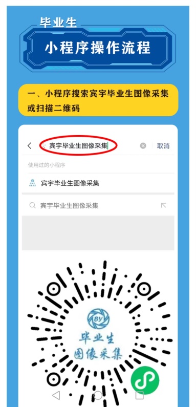 二、微信扫描“宾宇毕业生图像采集”小程序(附件2之二维码),开始实施图像采集。请按照程序导引,完成图像采集和提交。