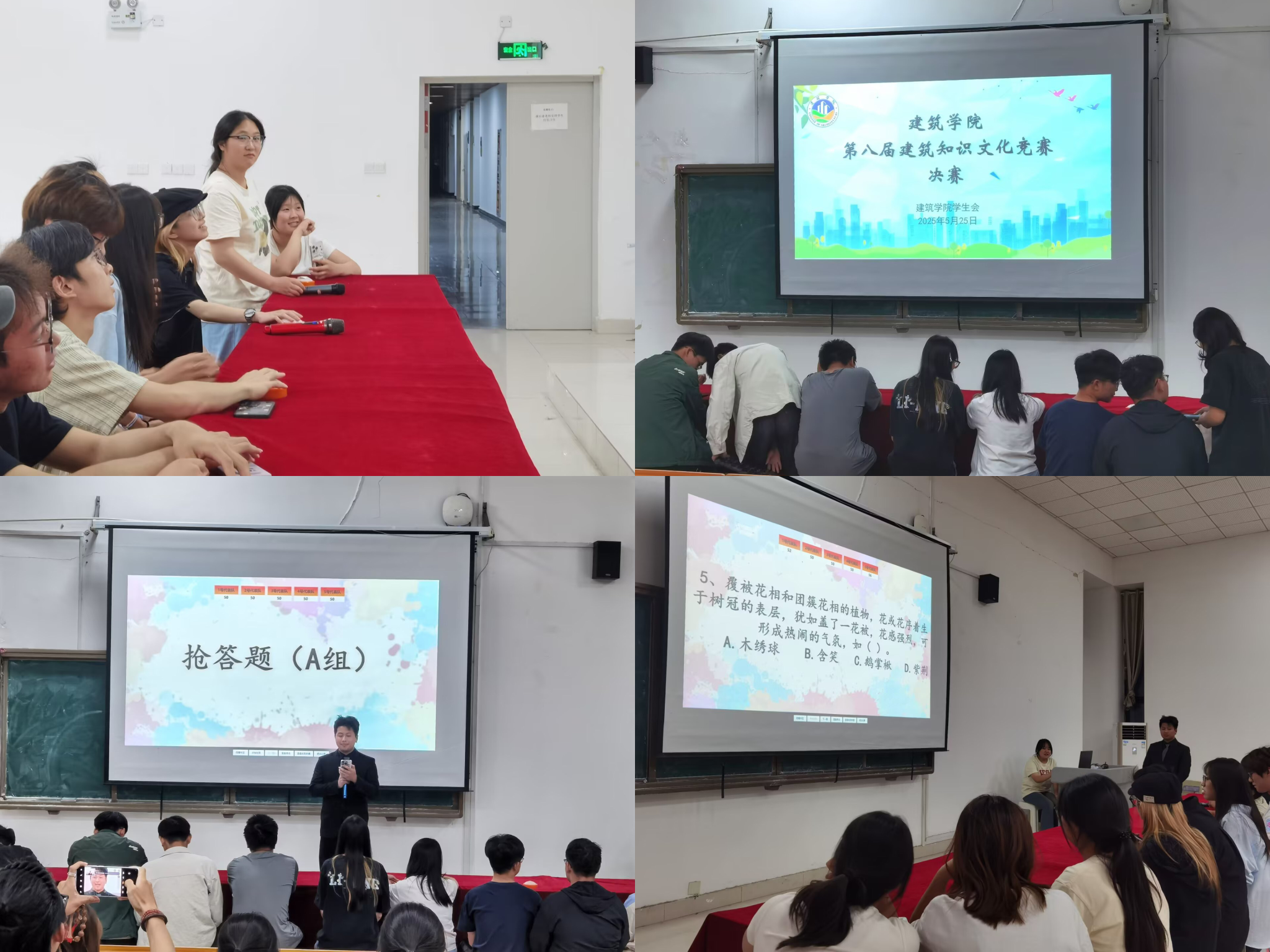 通过初赛选拔,共有10个班级进入决赛,通过抽签分成A、B两组进行作答,决赛中,参赛选手们精神饱满、反应迅速。在速答与抢答环节,选手们针锋相对,不仅展示了扎实的专业知识,也体现了团队合作的力量;最后的观众竞答环节中,在场观众积极参与,进行精彩的回答与互动,各参赛队伍均以出色的临场发挥,充分彰显了建筑学子的专业知识水平。