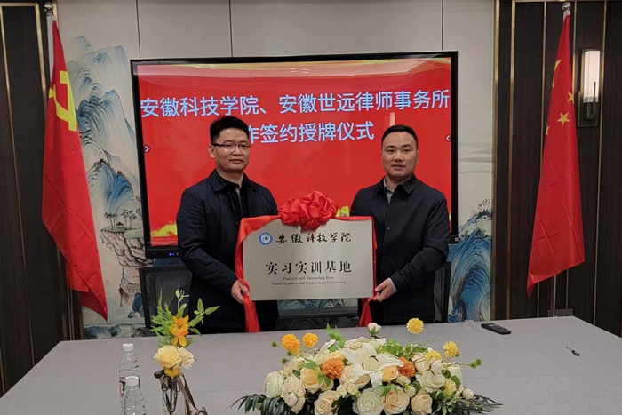 李晓东代表学院与安徽世远律师事务签署实习实训基地协议,牛永辉向安徽世远律师事务所授予“乐玩在线实习实训基地”牌匾。(特约通讯员:高晓宁 摄影:高晓宁 审核:牛永辉)
