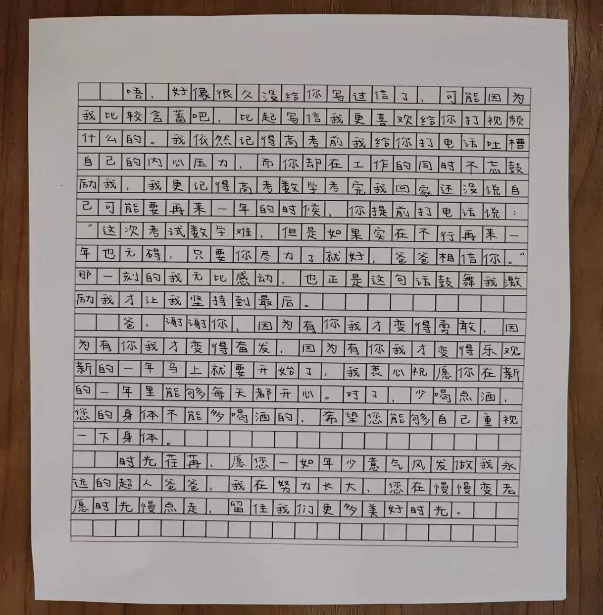 父母是我们岁月前行中最坚实的保障,新的一年即将开始,旧的一年即将结束,在过去一年的点点滴滴里,父母对我们的爱无微不至。心怀感恩,是对父母爱的积极回应和肯定。12月12日,人文学院举办了“拥抱亲情,书写感恩”活动。在本次活动中,同学们拍摄了与父母温馨的合照,用书信表达了对父母的感恩,促进了亲子之间的沟通交流,与父母久别重逢的拥抱,既是我们对父母爱的体现,也是我们对父母辛苦劳累的安慰。
