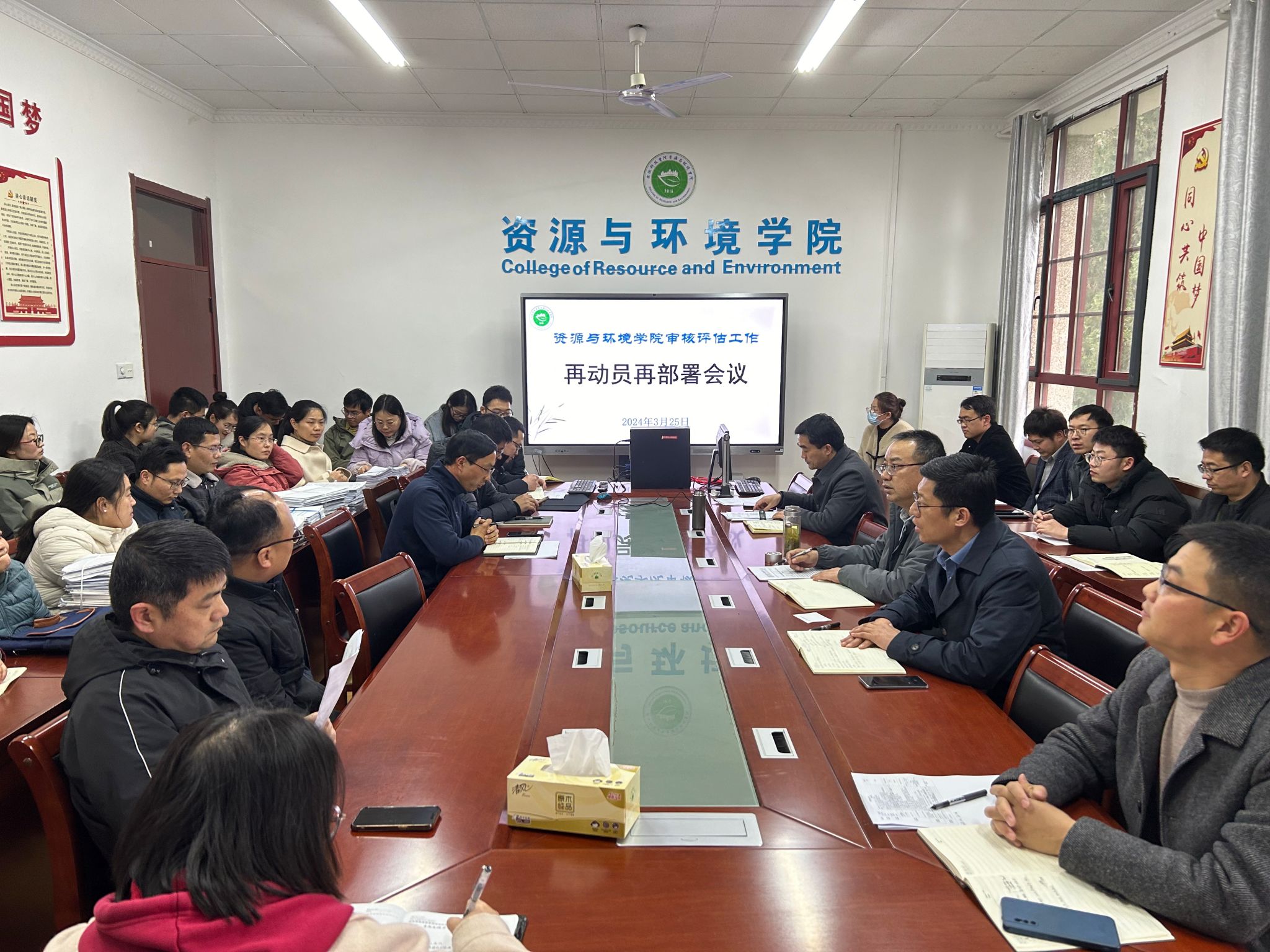 为进一步提升教育教学水平,确保学院顺利通过教育教学审核评估,资源与环境学院于3月25日下午在东办公楼会议室召开了全体教职工再动员再部署会议。资源与环境学院党政领导以及全体教职工参会,会议由学院党委副书记沈树周主持。
