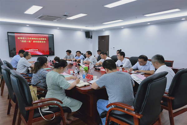 7月3日下午,蚌埠市人力资源和社会保障局“四进一促”进校园座谈会在我校龙湖校区综合楼四楼会议室召开。校党委委员、副校长黄远友出席会议并发表讲话。蚌埠市人力资源交流服务中心主任杨桓及丰原集团、凯盛工程技术有限公司、神舟机械等企业人力资源部负责人出席了会议。我校化学与材料工程学院、财经学院、管理学院、建筑学院、网络与信息工程学院等二级学院党总支书记及创新创业教育学院教师代表参加了座谈。会议由招生与就业工作处处长黄树桥主持。