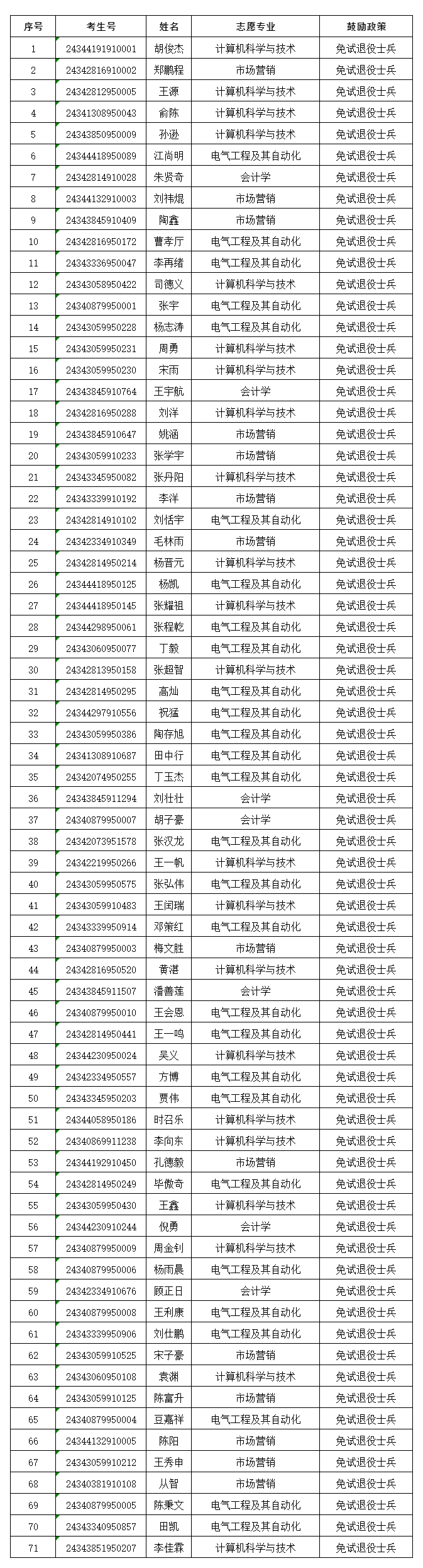 根据《乐玩在线2024年普通高校专升本招生章程》关于申请免文化课考试退役士兵专项计划,相关要求,经审核,胡俊杰等71名考生符合申请免试条件,现予以公布。如有异议或遗漏,请于4月9日12:00前,与乐玩在线招生办公室联系。联系电话:0550-67320410552-3197041