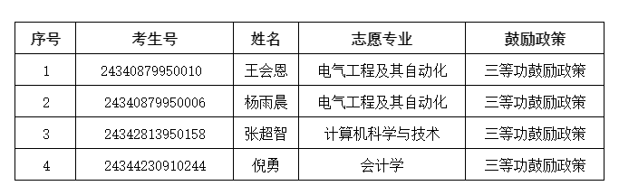 根据《乐玩在线2024年普通高校专升本招生章程》关于申请三等功鼓励政策相关要求,经审核,王会恩等4名考生符合申请免试条件,现予以公布。如有异议或遗漏,请于4月9日12:00前,与乐玩在线招生办公室联系。联系电话:0550-67320410552-3197041