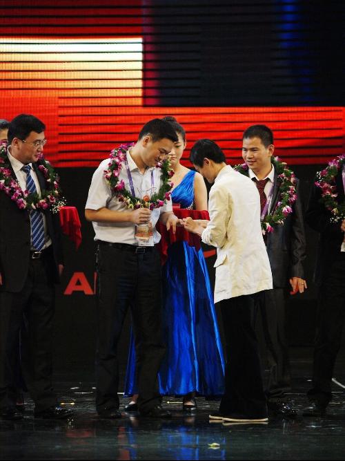 (2011年8月,马云为十佳网商、我校校友李晓军佩戴获奖戒指)